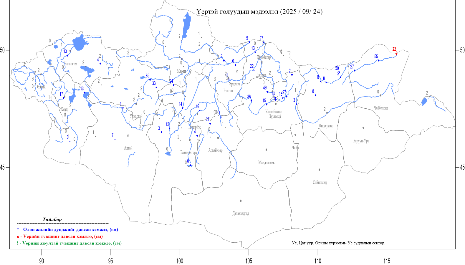 - Харин Туул гол олон жилийн дунджаас 20-60 см ахиу түвшинд байлаа. Орхон, Сэлэнгэ голуудын усны түвшин нийт уртын дагуудаа өмнөх арав хоногийн турш өөрчлөлт багатай байсан ба арав хоногийн дундаж түвшинг олон жилийн дундаж болон 2024 оны мөн үеийнхтэй харьцуулахад 5-60 см бага байна.